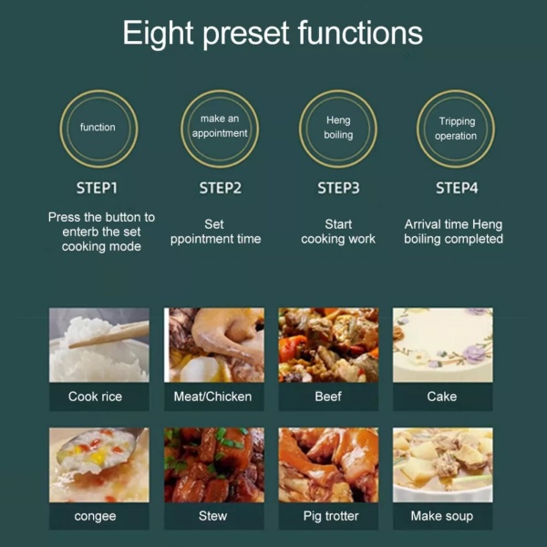 -Userfriendly control panel: features a userfriendly control panel with preset cooking modes for rice, soups, and stews, making meal preparation efficient