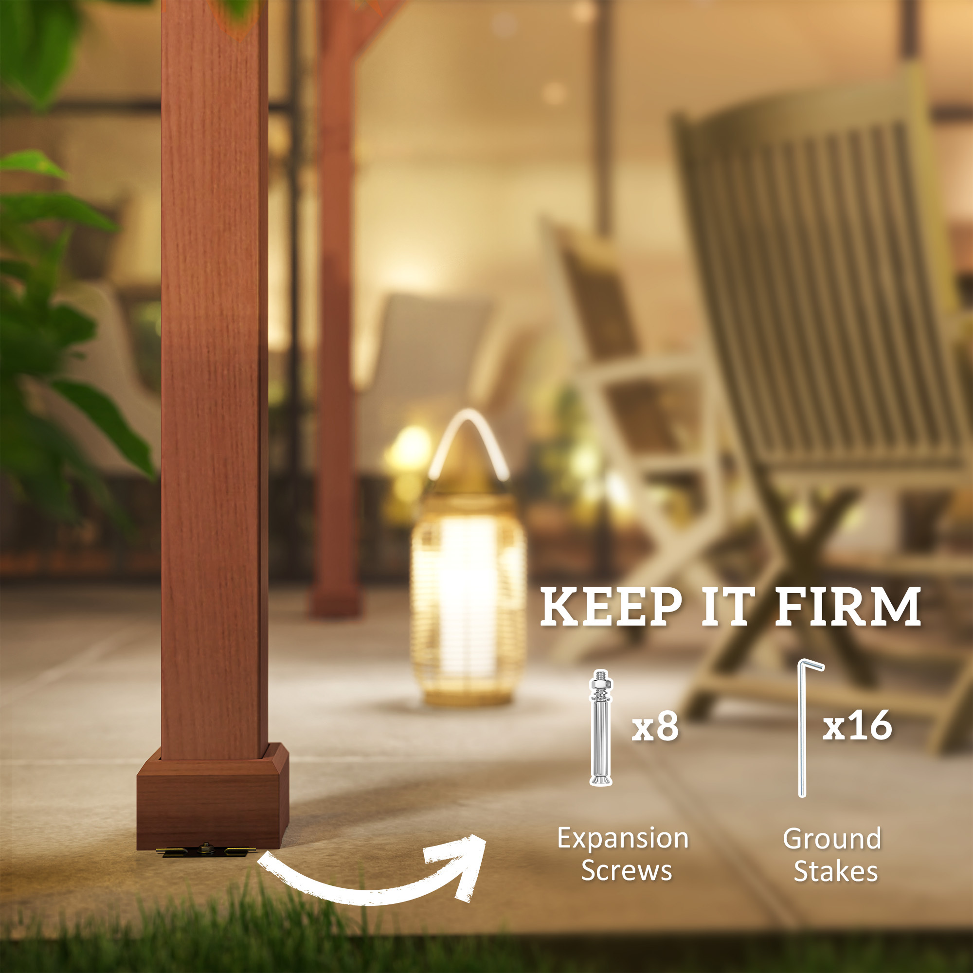 - – Strong 4″ x 4″ columns, expansion screws, and ground stakes ensure stability