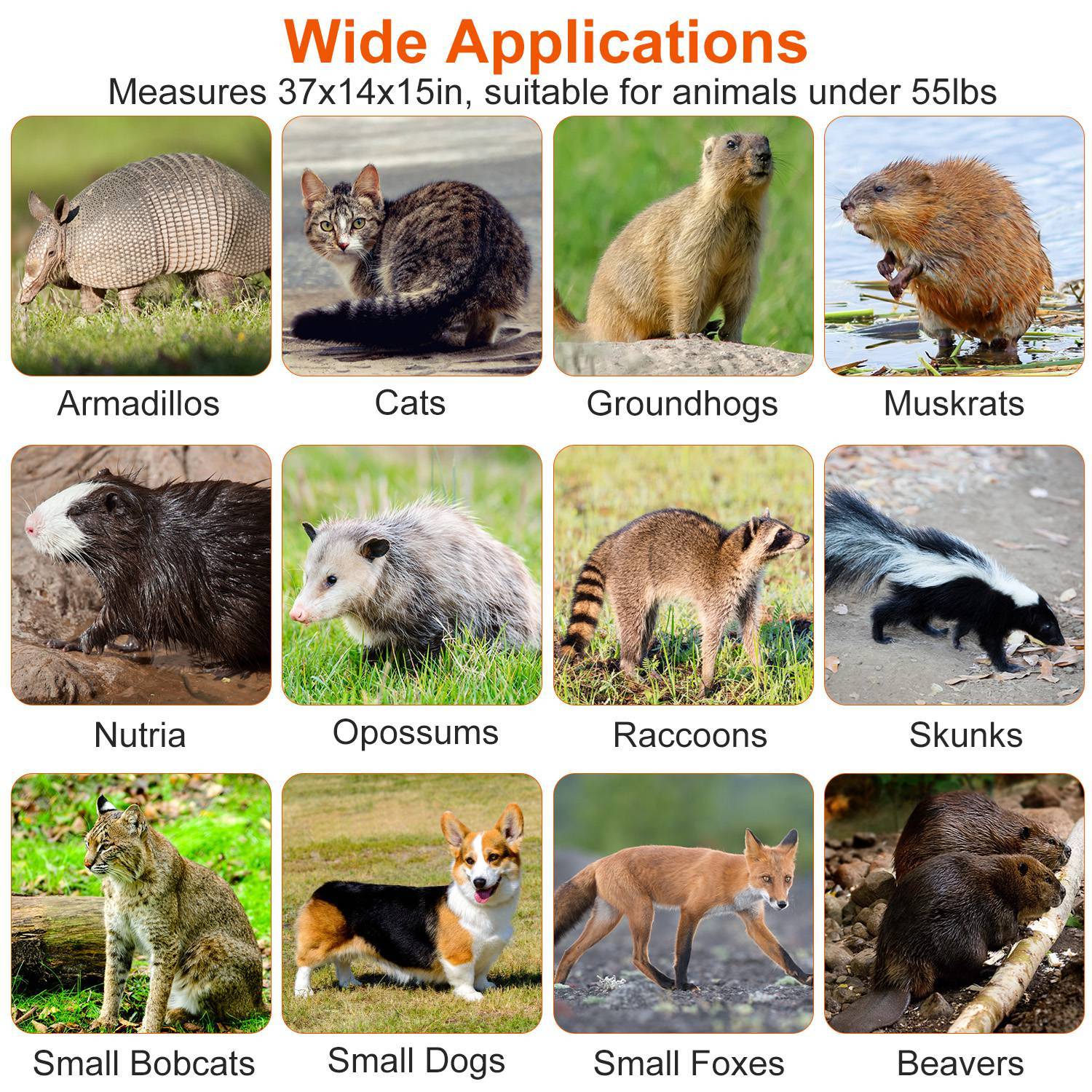 - *Versatile Uses*: Measuring 37x14x15 inches,this trap is perfect for catching raccoons,armadillos,cats,small dogs,skunks,foxes,marmots,and beavers under 55 lbs. It’s an effective solution for controlling pest issues on farms,dealing with wildlife release,or addressing unwanted animal invasions.