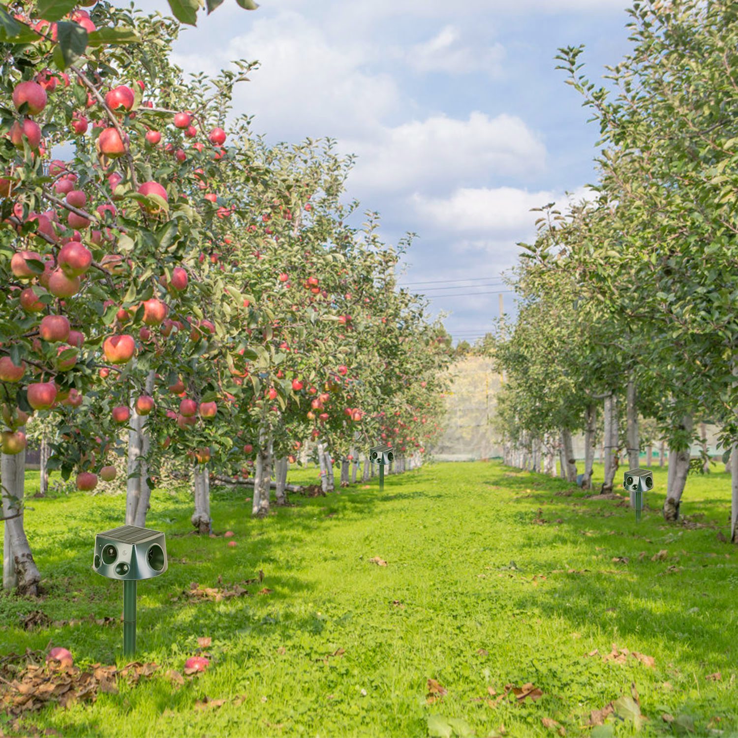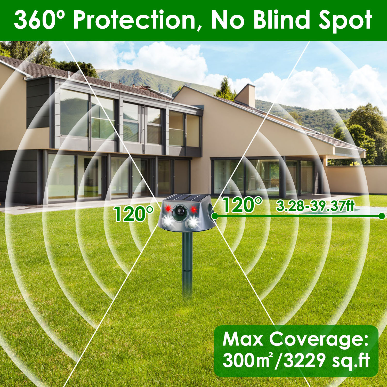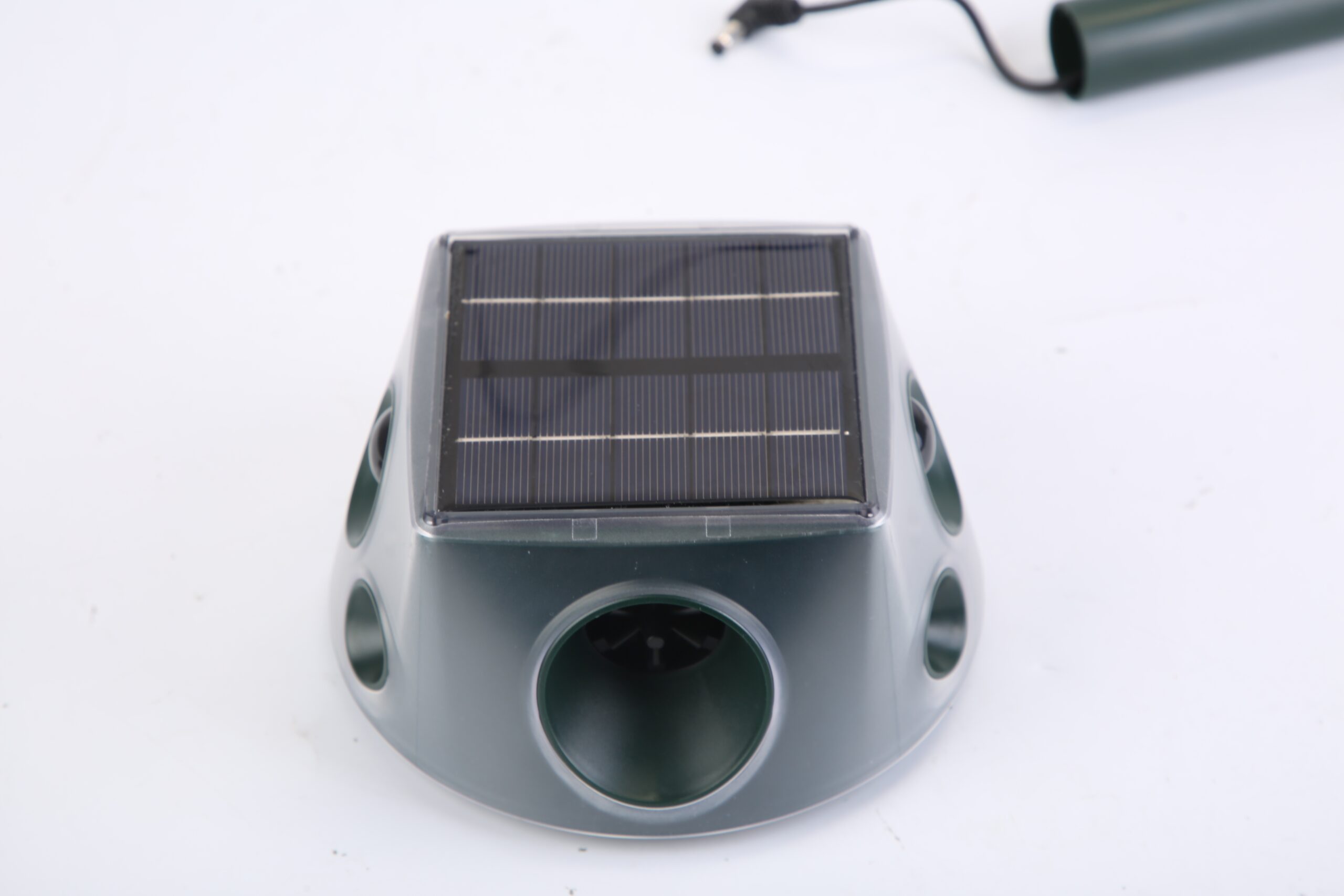 - * 3 Efficient Modes *:Our ultrasonic solar animal repeller provides 3 specially designed modes,which utilizes 65KHz ultrasound,alarm sound,random analog sounds and strobe light. These definitely drive the unwanted animals away,such as moles,bats,squirrels,hedgehogs,birds,wild cats,wild dogs,wild boars etc.. The stimulative police whistle can even scare thieves away to protect our garden and house.
