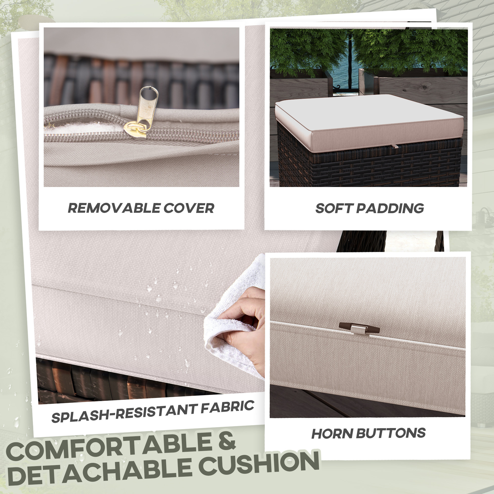 - – Removable zippered cushion covers for easy cleaning