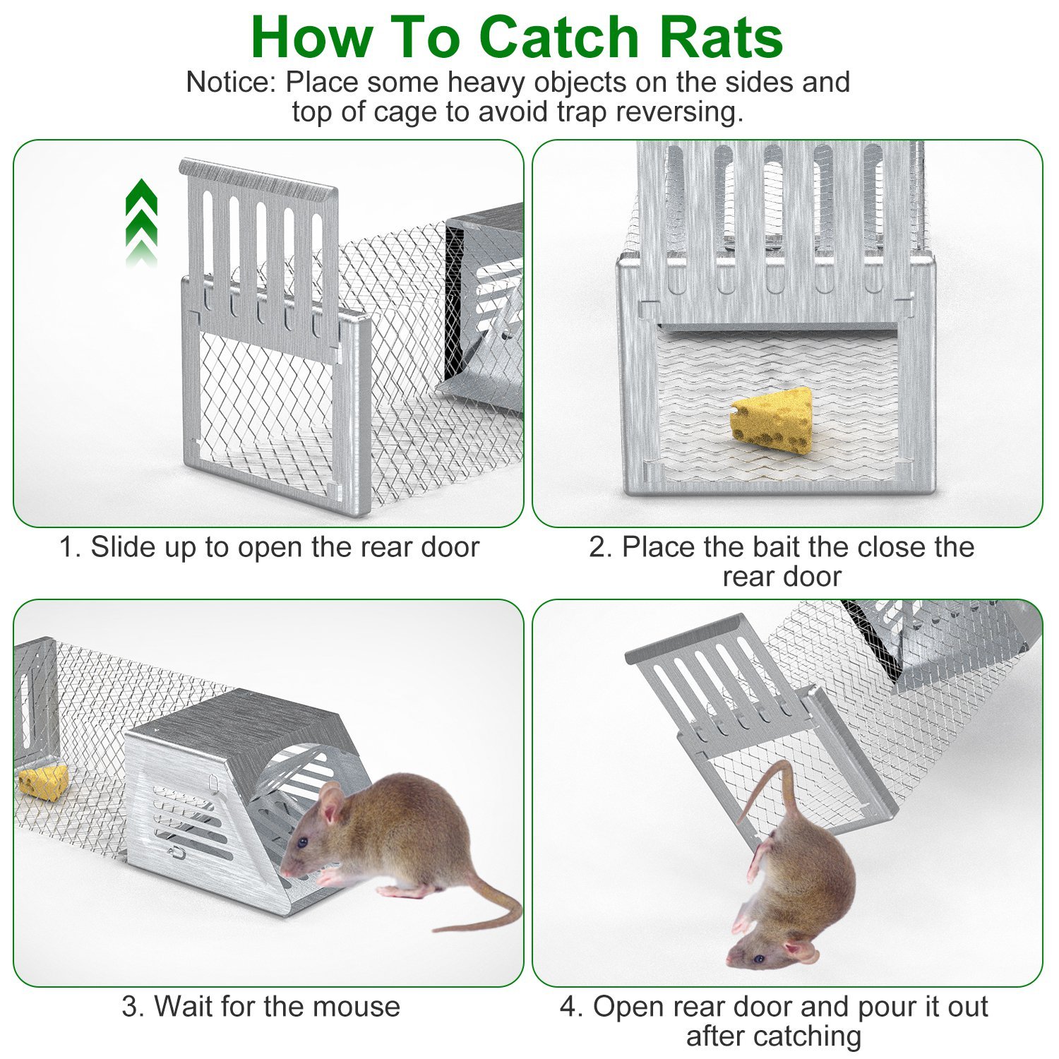 - *Assembly Free Setup*: No need to laboriously learn the complicated installation,our assembly-free mouse trap cage is your perfect choice to get rid of annoyed rats. Due to the lightweight design of this rat trap,please place some heavy objects on the sides and top of it to prevent mice or other small animals from escaping after the mouse trap reverses.