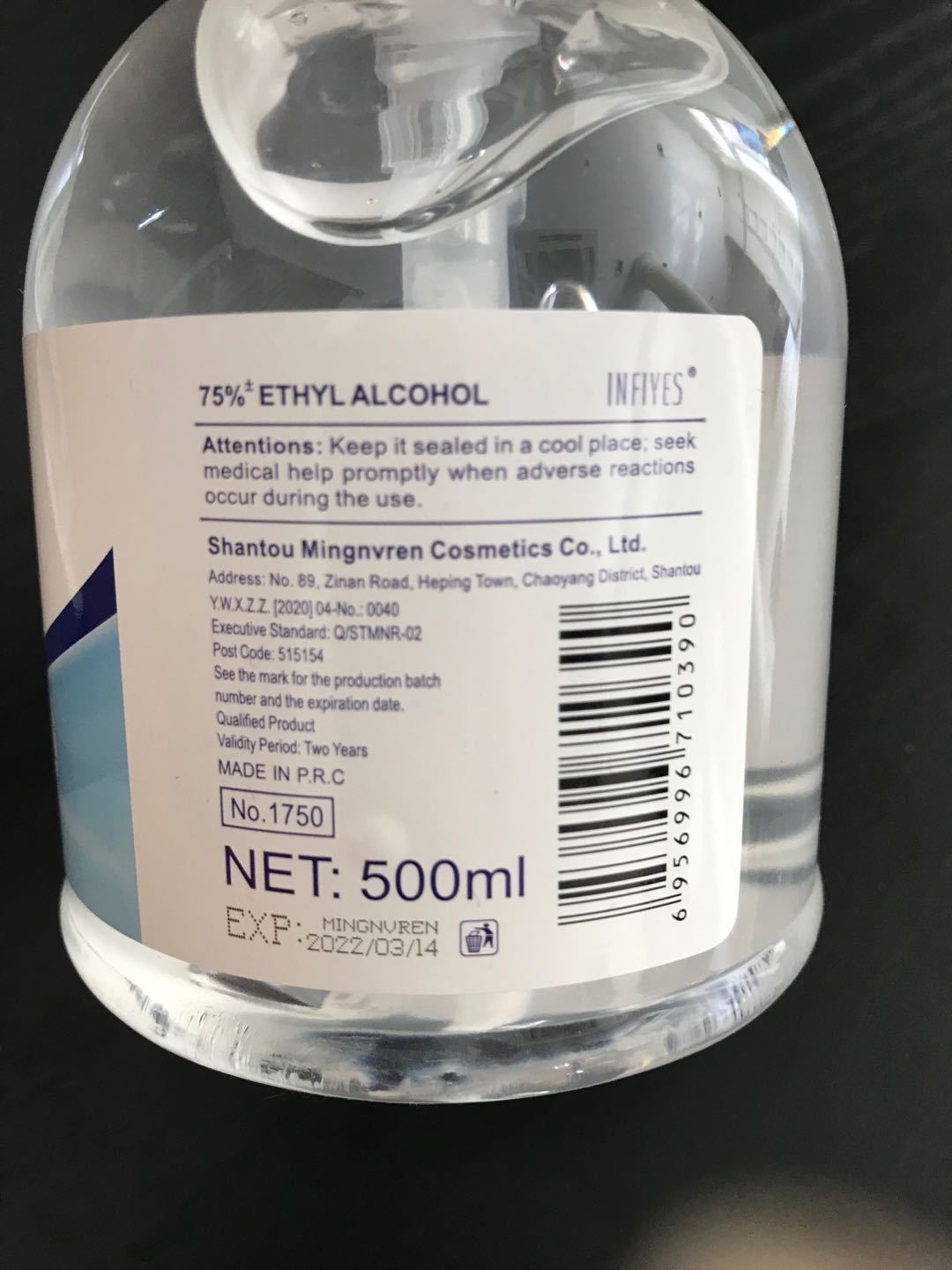 99.9% effective bacteriostasis contains 75% ethyl alcohol Net.:500ml
