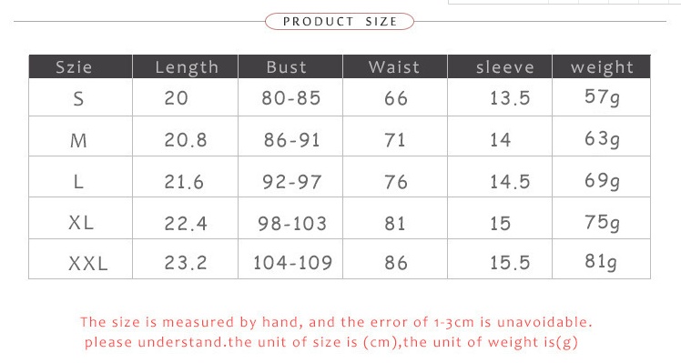 Size S M L XL XXL Length(cm) 20 20.8 21.6 22.4 23.2 Bust(cm) 80-85 86-91 92-97 98-103 104-109 Waist(cm) 66 71 76 81 86 Sleeve(cm) 13.5 14 14.5 15 15.5